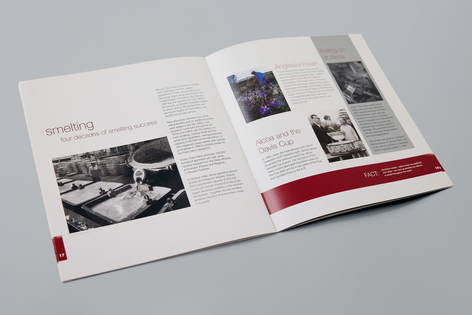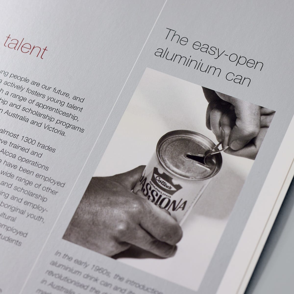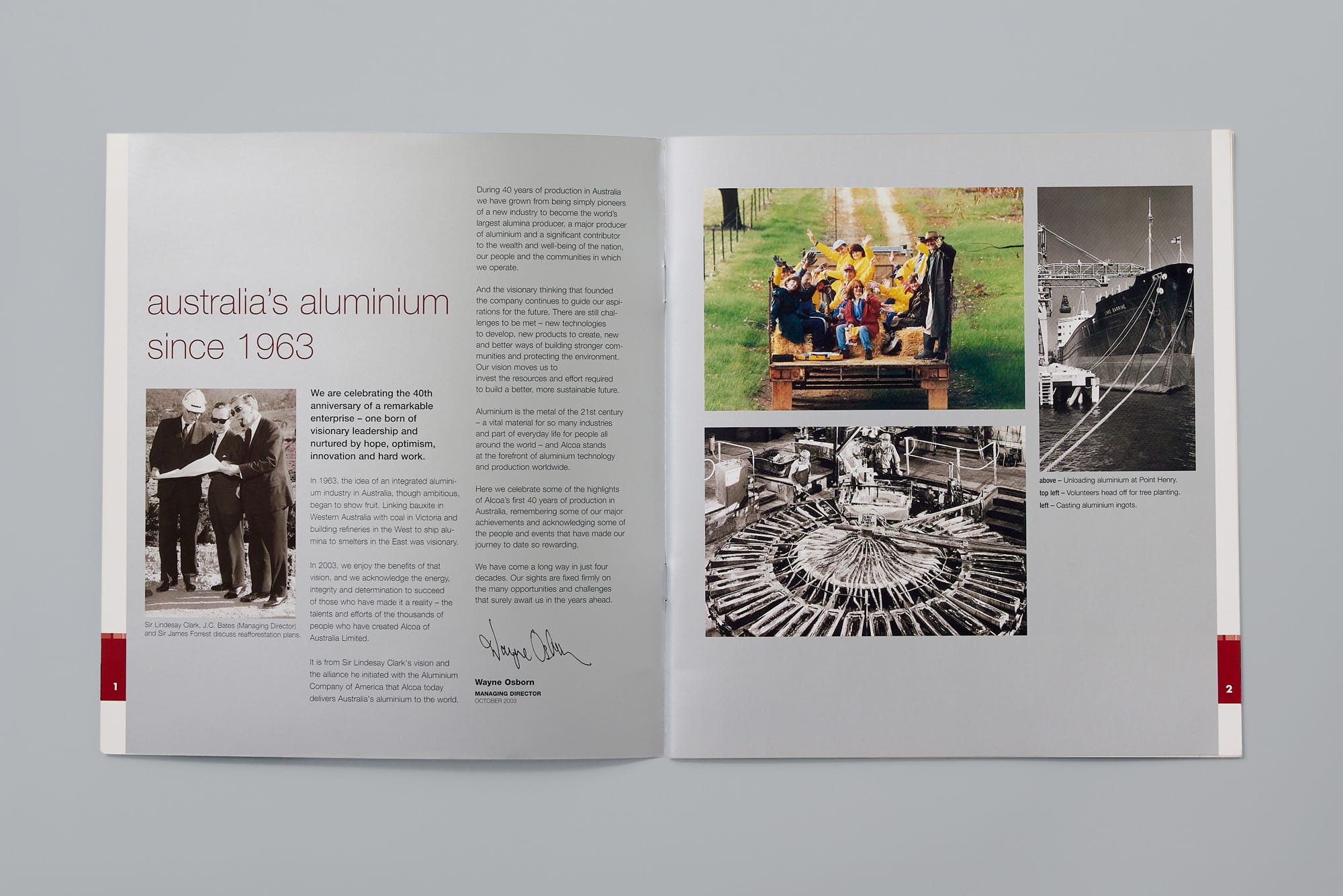 As part of a broader brand redefinition project to consolidate Alcoa’s position in the country, undertaken by Bonser Design, we crafted a commemorative booklet celebrating its legacy and the role of recyclable aluminium in modern Australian life.