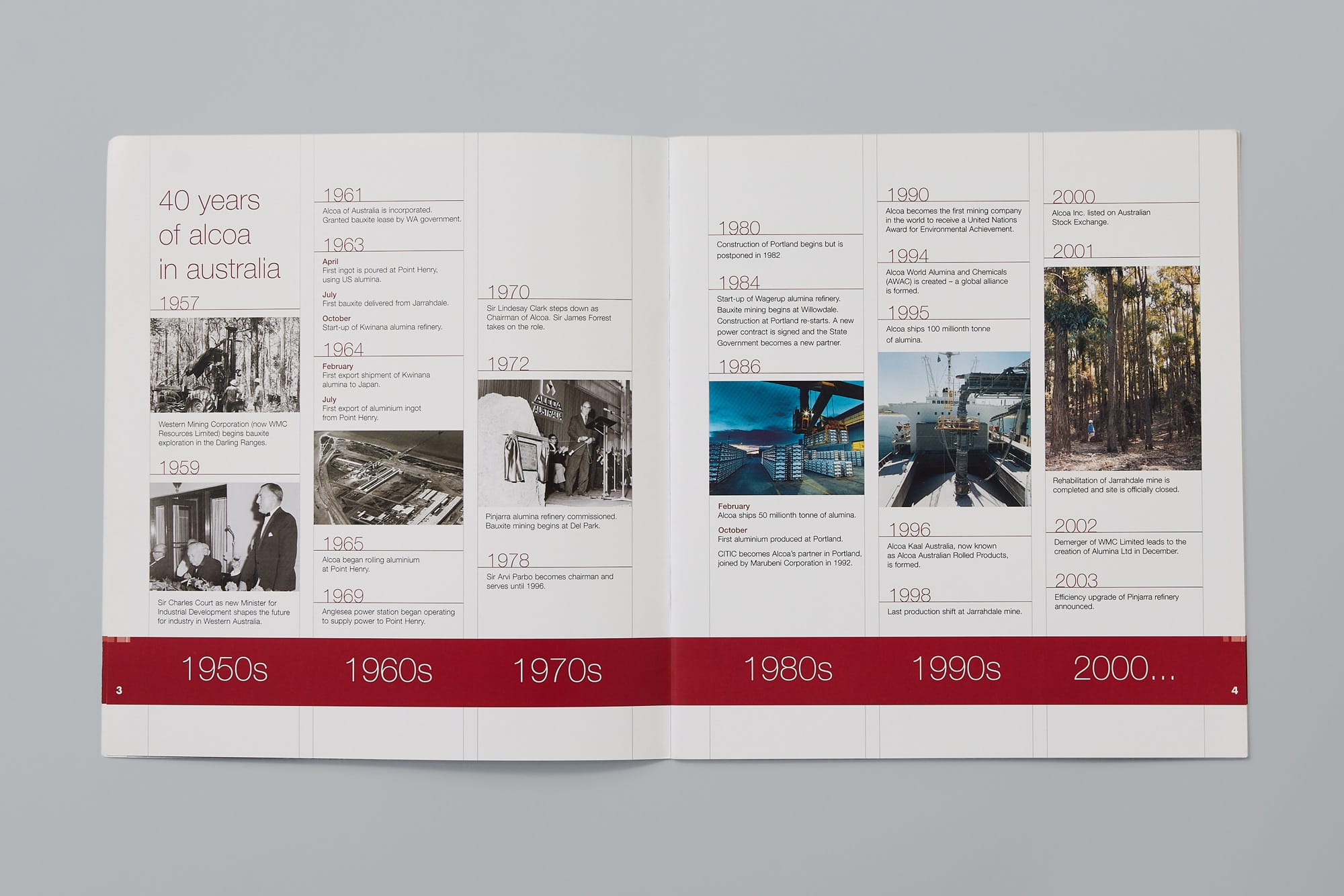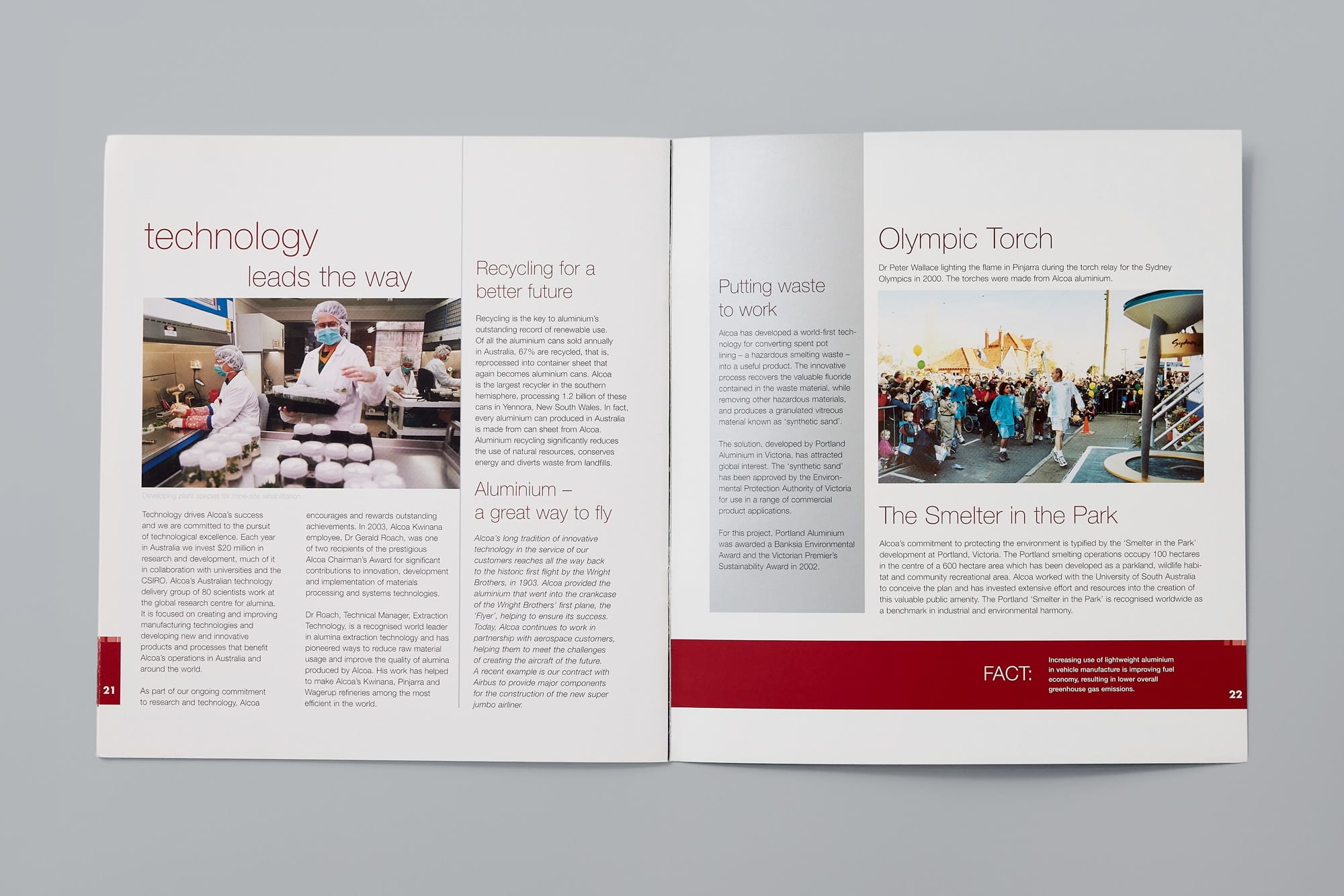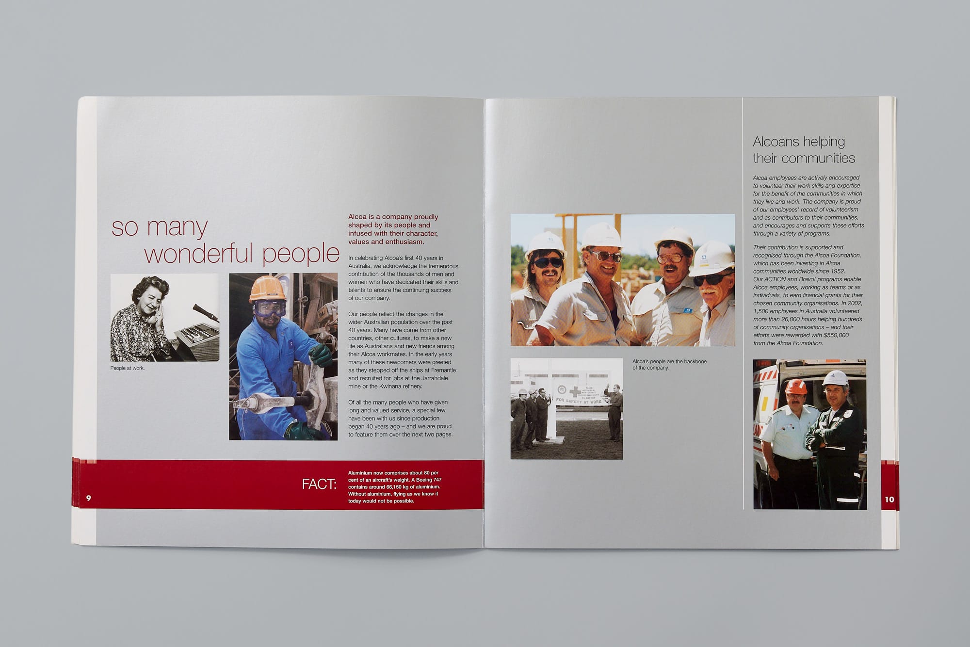 As part of a broader brand redefinition project to consolidate Alcoa’s position in the country, undertaken by Bonser Design, we crafted a commemorative booklet celebrating its legacy and the role of recyclable aluminium in modern Australian life.