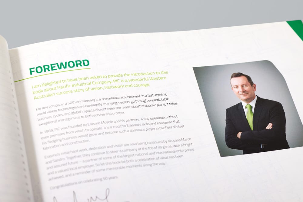 Celebrating 50 Years provides a historical context around the success and longevity of our respected WA family business. The process of creating this professional publication has given us the opportunity to reflect on the journey to date and to revisit the many significant projects PIC has delivered. We have received many compliments from business acquaintances, friends and family. It has captured the essence of who we are, the challenges we have faced, what we have proudly delivered and our aspirations for the future.”